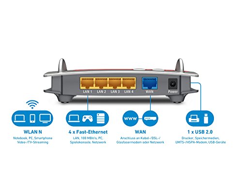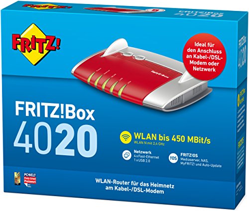 AVM FRITZ!Box 4020 WLAN-Router (für Anschluss an Kabel-/DSL-/Glasfasermodem, WLAN N, 450 MBit/s (2,4 GHz) 4 x Fast-Ethernet, 1 x USB 2.0, Mediaserver) rot/weiß, deutschsprachige Version