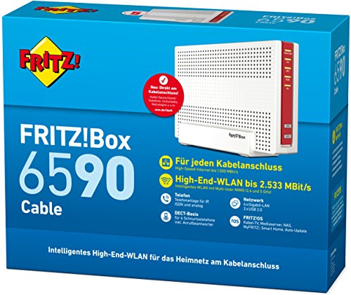 AVM FRITZ!Box 6590 Cable WLAN AC + N Router (DOCSIS-3.0-Kabelmodem, Dual-WLAN AC+N mit 1.733 Mbit/s (5 GHz) + 800 MBit/s MBit/s (2,4 GHz), VoIP-Telefonanlage, DECT-Basis)