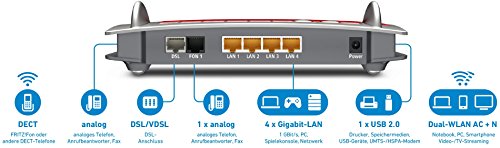 Das Beste aus Ihrem Anschluss Optimieren Sie die Möglichkeiten aus Ihrem Internetzugang. Mit dem schnellen WLAN AC können Sie Daten im 5-GHz-Band mit bis zu 866 MBit/s und im WLAN N 2,4-GHz-Band bis zu 450 MBit/s übertragen. Bieten Sie Ihren Freunden und Gästen einen separaten Gastzugang an und halten Sie Ihr Heimnetz weiterhin privat. Die beste Unterhaltung führen und erleben Die IP-basierten-Anschlüsse können Sie für analoge und IP-Telefone sowie für Faxgeräte nutzen und in einem übersichtlichen Menü bequem verwalten. Dabei garantiert Ihnen die unterstütze HD-Telefonie Gespräche in bester Qualität. Mit Hilfe der USB 2.0 Schnittstelle ist es möglich, auf einen Speicher über das gesamte Netzwerk zuzugreifen. Damit entsteht ein Mediaserver, der die Wiedergabe von Videos, Musik und Fotos auf den netzwerkgebundenen Ausgabegeräten ermöglicht. Mit Sicherheit Sicher Ihre Kommunikation wird durch ein umfangreiches Sicherheitskonzept geschützt. Die voreingestellte Firewall, Filterfunktionen und Verschlüsselung für DECT und WLAN sorgen für die Sicherheit Ihrer Daten. Aufgrund der ständigen Weiterentwicklung und kostenloser Updates bleiben Sie dabei immer auf dem neusten Stand.