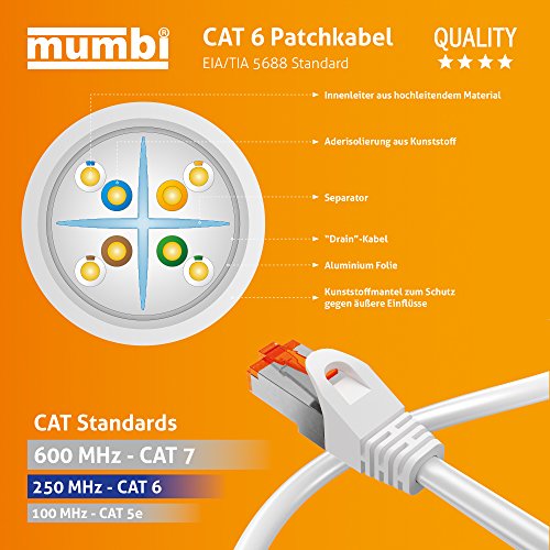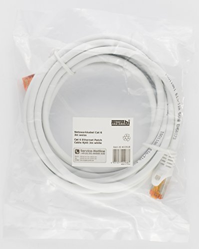 mumbi Cat.6 FTP Ethernet Lan Netzwerkkabel – 3 Meter in weissbis 1000 Megabit-Geschwindigkeit für Ihr Netzwerk! Das leistungsstarke mumbi Cat.6 LAN Kabel ist geeignet für 10/100/1000/MBit Ethernet Netzwerke und ist problemlos für alle DSL-Geschwindigkeiten verwendbar. Somit verbinden Sie schnell und einfach alle netzwerkfähigen Geräte miteinander – von PC, Laptop, Router bis hin zu Hubs, Switchs und Ihrer Spielkonsole.Durch die aus hochleitendem Material bestehenden Innenleiter erreichen sie eine sehr schnelle Gigabit-Datenanbindung von bis zu 250 MHz. Gewöhnliche Cat-5-Netzwerkkabel erreichen hier nur eine max. Geschwindigkeit von bis ca. 100MHz.Unsere mumbi Cat.6 FTP Kabel reagieren deutlich unempfindlicher auf Störungen und sind durch Ihre Biegsamkeit und eine Knickschutzhülle enorm robust und elastisch verarbeitet – ideal für eine reibungslose Verlegung in Ihrer Wohnung.Geeignet für Heimnetzwerke, Firmennetzwerke, Router, Switch, Hubs, Patch-Pannels, Patchfelder, Modems, Powerlan, Netzwerkdrucker, Spielkonsolen, uvm. Features:- 2 x RJ45 Stecker- 3m Patchkabel CAT.6 (Gigabit-LAN 10/100/1000 MBit) – Übertragungsgeschwindigkeit: 1000 Mbit (1 Gigabit/s) – 100% abwärts- sowie aufwätskompatibel – inkl. Knickschutzhülle für die Stecker – ROHS konform – hochwertige, halogenfreie Isolierung – Farbe: weiss3m CAT.6 Patch Kabel in weiss