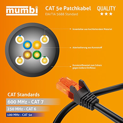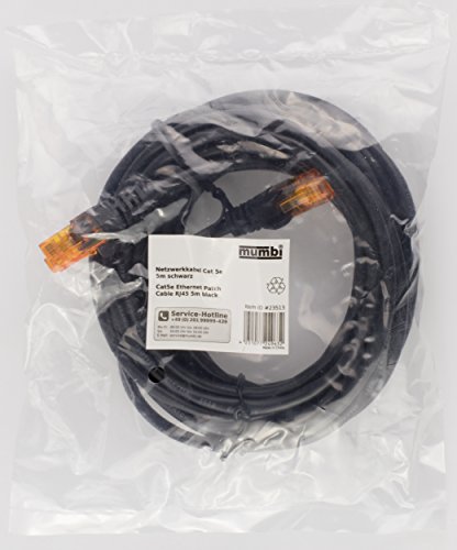 mumbi Cat.5e Patchkabel – 5 Meter in schwarzbis zu 1000 Megabit pro Sekunde für Ihr Netzwerk! Das leistungsstarke mumbi Cat.5e LAN Kabel ist geeignet für 10/100/1000/MBit Ethernet Netzwerke und ist problemlos für alleDSL-Geschwindigkeiten verwendbar. Somit verbinden Sie schnell und einfach alle netzwerkfähigen Geräte miteinander – von PC,Laptop, Router bis hin zu Hubs, Switchs und Ihrer Spielkonsole.Durch die aus hochleitendem Material bestehenden Innenleiter erreichen sie eine sehr schnelle Gigabit-Datenanbindung von bis zu 100 MHz. Alle Cat. 5e Netzwerkkabel sind auch abwärtskompatibel zu herkömmlichen Cat-5 Kabeln.Unsere mumbi Cat. 5e Lan Kabel reagieren deutlich unempfindlicher auf Störungen und sind durch Ihre Biegsamkeit und eine Knickschutzhülle enorm robust und elastisch verarbeitet – ideal für eine reibungslose Verlegung in Ihrer Wohnung.Geeignet für Heimnetzwerke, Firmennetzwerke, Router, Switch, Hubs, Patch-Pannels, Patchfelder, Modems, Powerlan, Netzwerkdrucker, Spielkonsolen, uvm. Features:- 2 x RJ45 Stecker- 5m Patchkabel CAT.5e (Gigabit-LAN 10/100/1000 MBit) – Übertragungsgeschwindigkeit: 1000 Mbit (1 Gigabit/s) – 100% abwärts- sowie aufwätskompatibel – inkl. Knickschutzhülle für die Stecker – Farbe: schwarz5m CAT.5e Ethernet Lan Netzwerkkabel in schwarz